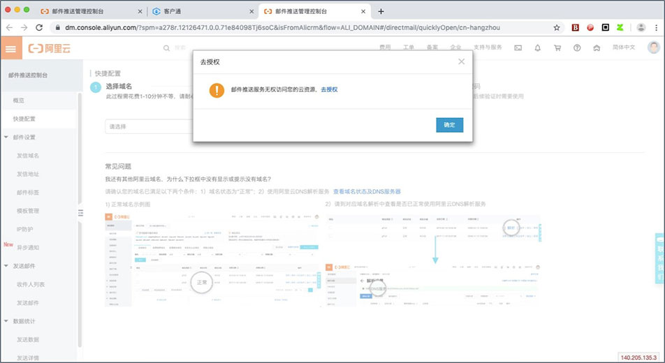 2)再次回到客戶通EDM配置頁(yè)面,點(diǎn)擊“方式一”,系統(tǒng)會(huì)提示 “郵件推送服務(wù)無(wú)權(quán)訪問您的云資源” ,操作授權(quán)