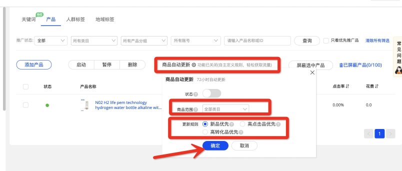 添加方式2:您可以點擊【商品自動更新】,設(shè)置不同類目商品自動更新加入計劃(新品優(yōu)先、高轉(zhuǎn)化優(yōu)先、高點擊優(yōu)先);